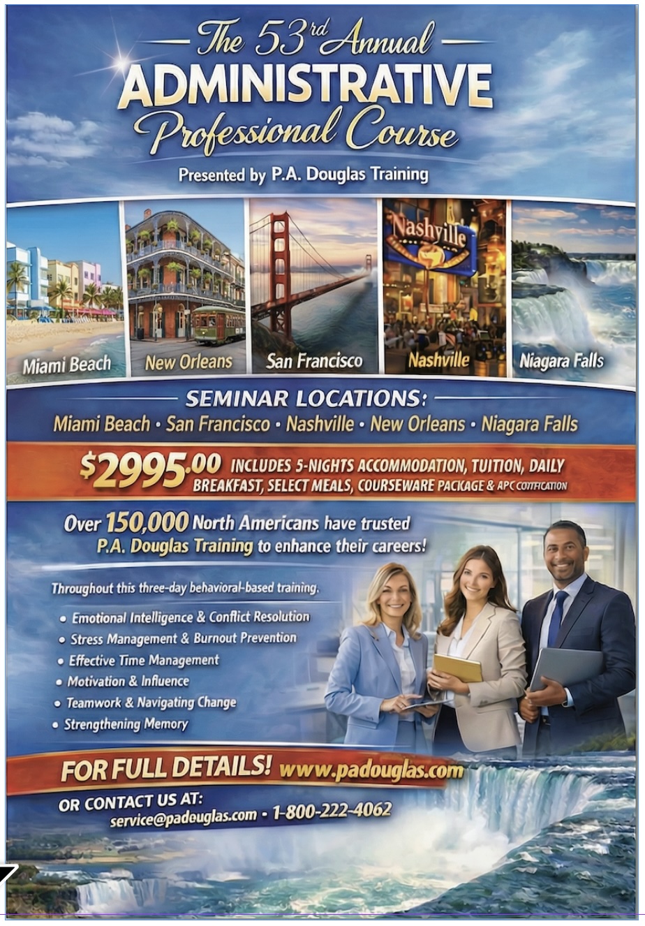 P.A. Douglas has set the gold standard for excellence in Administrative and Executive Assistant training for fifty years. It is where administrative professionals come to learn, network, and engage with leaders in the field. No other seminar or event provides the comprehensive, high-quality program as the 53rd Annual Administrative Professional Course.